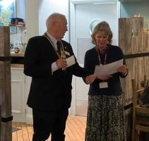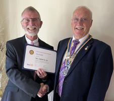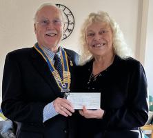 Presentation by President Brian to Jane Toffel, MHA President of Cheque for £3000 for the provision of 3 Defibrillators for their 3 premisesSat 1st November 2025 Paul Harris Award