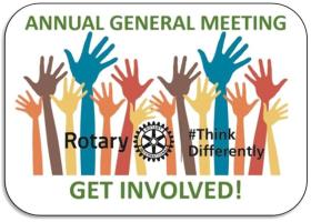 Please do your best to attend the AGM; reports on the various activities, i.e., Environment, Youth, International, Foundation, Community, etc.