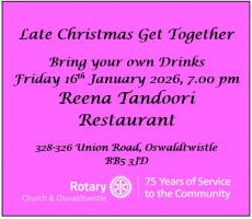 Several local groups and charities are being invited to highlight their good work in the Community. Start with light refreshments, a presentation on Rotary, followed by a short presentation from each group, completed with networking and drinks.