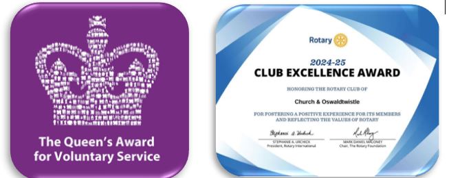 The Queen's Award for Voluntary Services, the equivalent of an MBE, was awarded to Church & Oswaldtwistle Rotary.