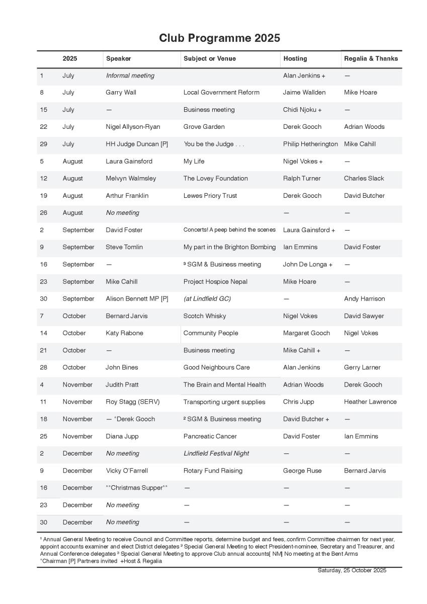 Our membership is drawn from leaders in the professional, business and voluntary sectors in Mid Sussex and the aim of our Club, as of all Rotary Clubs, is to promote fellowship among our members, high ethical standards in business, and service in our local community and worldwide.