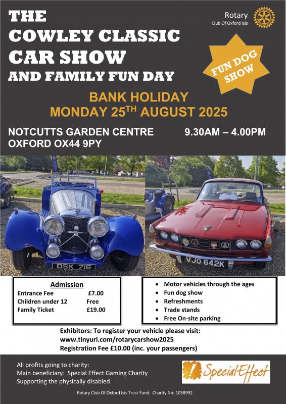 We have a number of fund-raising events during the year for local charities and internationally, these events include our main event of the year which is the Cowley Classic Car Show followed by an evening cinema at Notcutts Garden Centre, Drive it Days, a fishing competition and a Golf Day.
