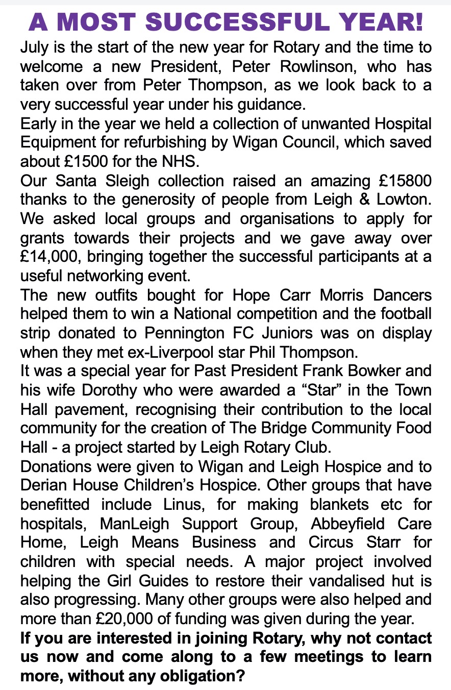 The year started with a collection at Tesco, of unwanted Hospital Equipment for refurbishing by Wigan Council. This saved the NHS about £1400 and we have been asked to repeat the event in 2024. In our Dragons’ Den event, we gave away over £10,000, spread amongst 8 local charitable groups, following their presentations on how the funds would be used. A Boxing Tournament was held which raised £2664 for Leigh Amateur Boxing Club for the refurbishment of club facilities.