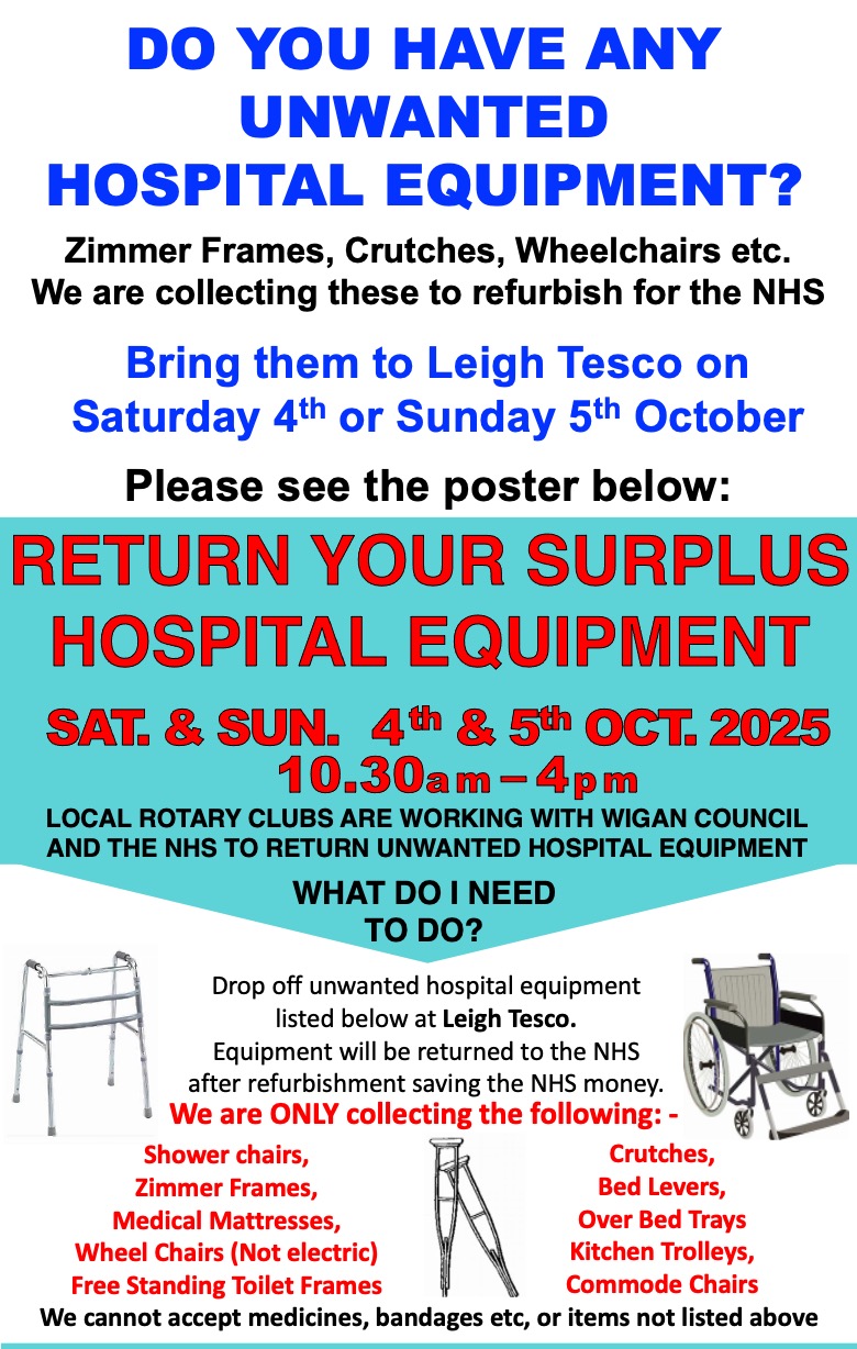 Following a successful collection of surplus equipment last year, Leigh & Wigan Rotary Clubs staged another event last weekend saving the NHS around £2500.
