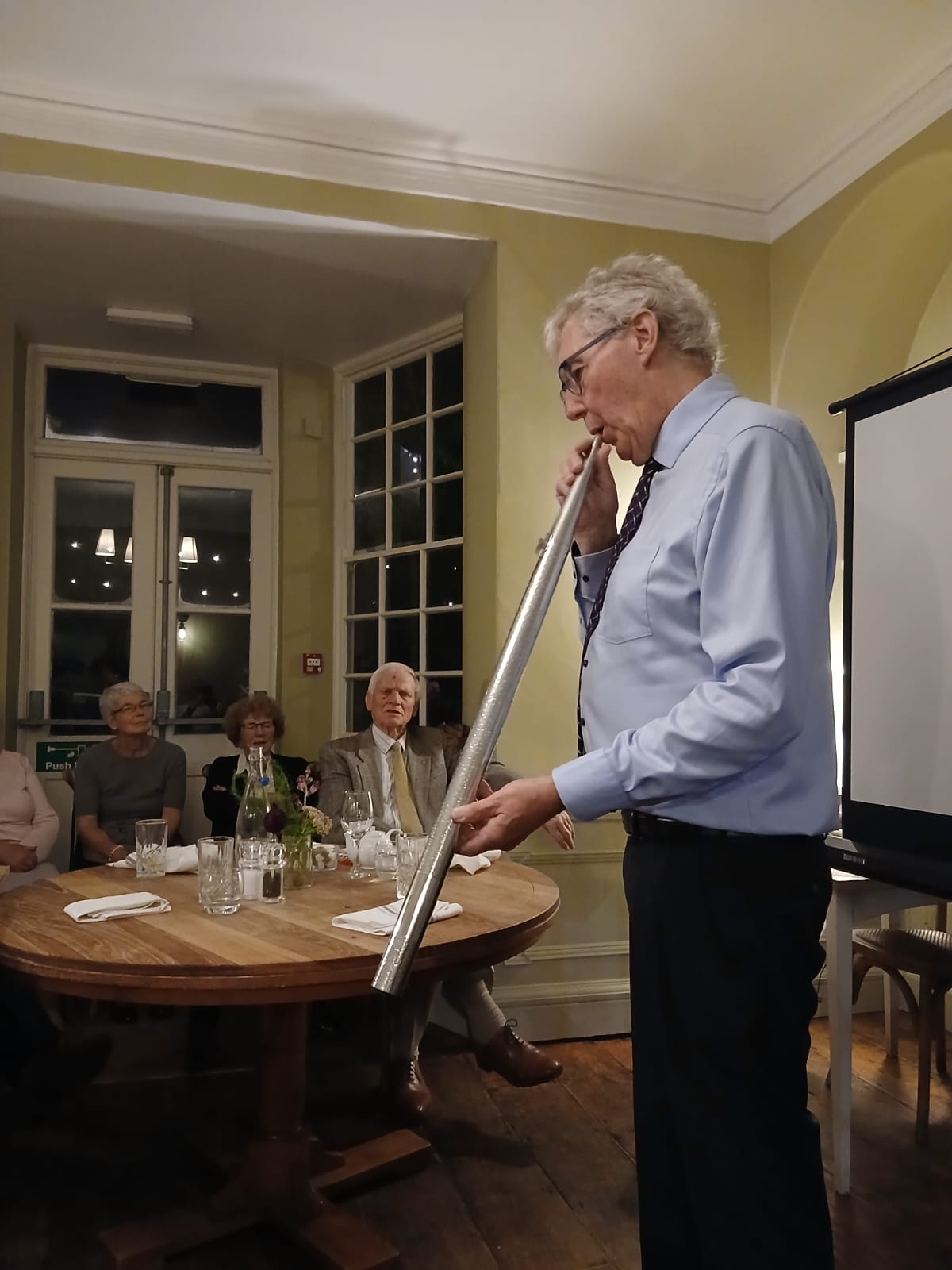 Michael Latham demonstrates the workings of an organ pipe at speaker meeting