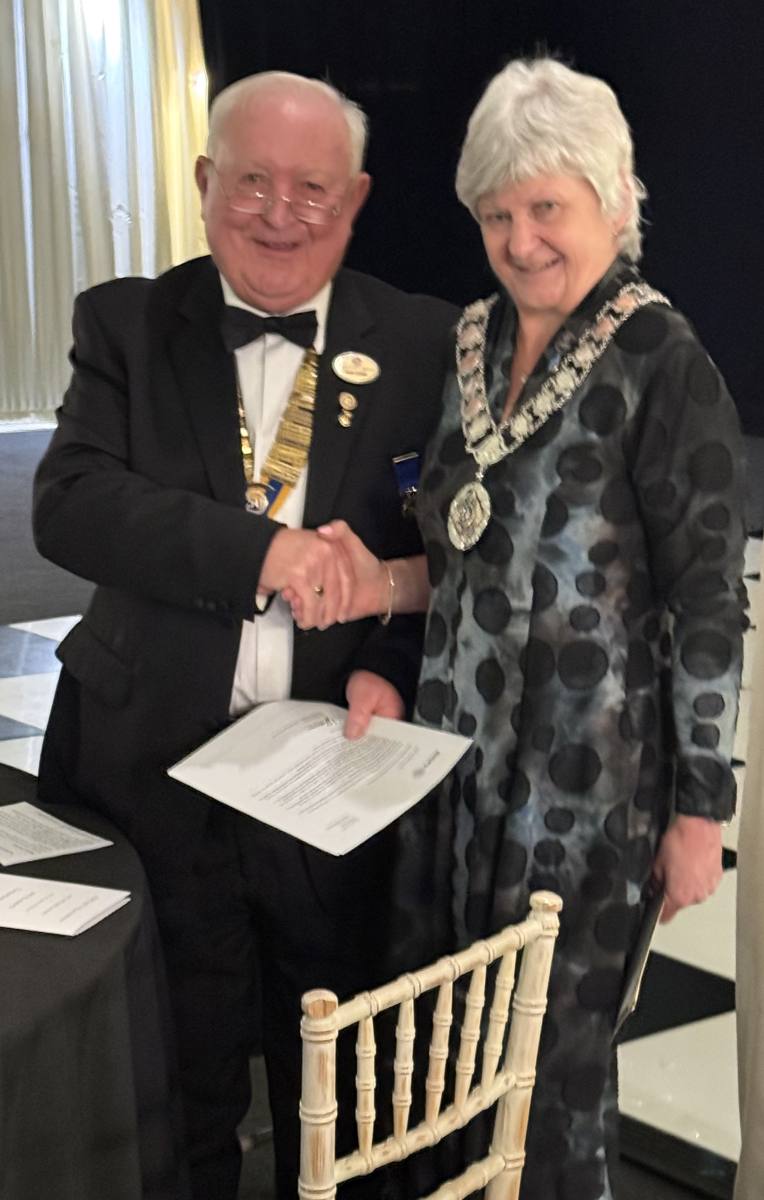 District Governor Moira Penney presents President Keith with the letter of congratulation and thanks from Rotary International President Francesco