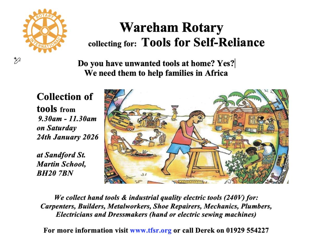 We will be collecting DIY or trade tools and sewing machines again on Saturday 24th January 2026. The tools will be sent to "Tools for Self-Reliance" at Netley Marsh to be refurbished and packaged into sets ready for sending to Africa.