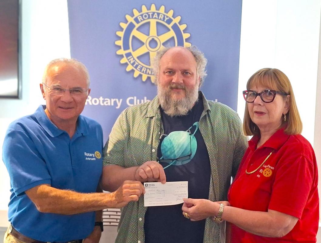 Rogan Frith of Arbroath Mens Shed received a cheque for £100 from President Liz at a recent meeting of the Club. Danny Gentles said that the award was in recognition for the signage the Mens Shed provided at the recent Golf Tri-Am