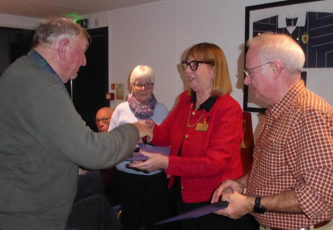 Rogan Frith of Arbroath Mens Shed received a cheque for £100 from President Liz at a recent meeting of the Club. Danny Gentles said that the award was in recognition for the signage the Mens Shed provided at the recent Golf Tri-Am