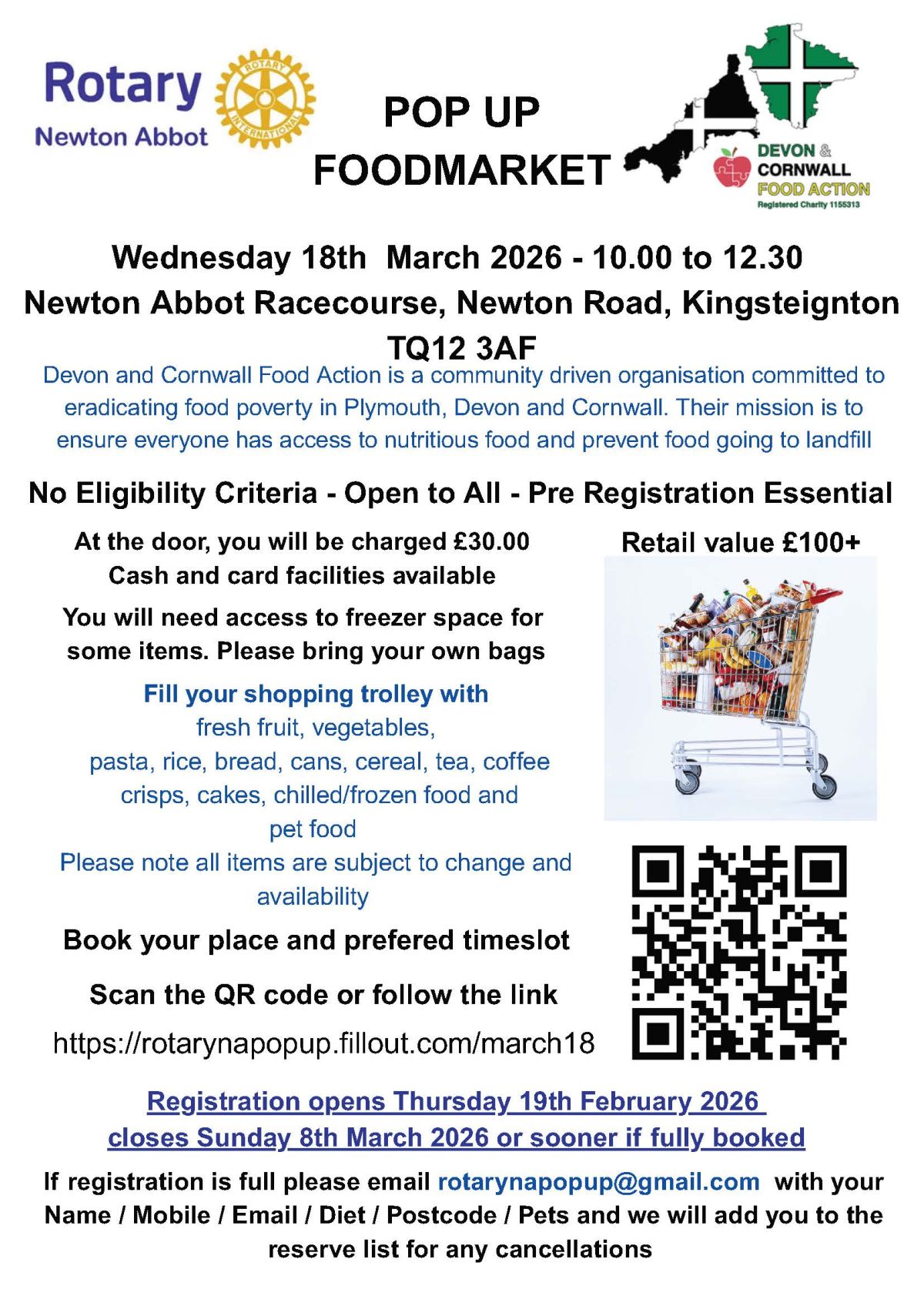 moreThe 4th Pop Up Supermarket is to be staged at the Racecourse aimed at redistributing food that would otherwise been discarded - organised by Newton Abbot Rotarian Nick Richards PHF