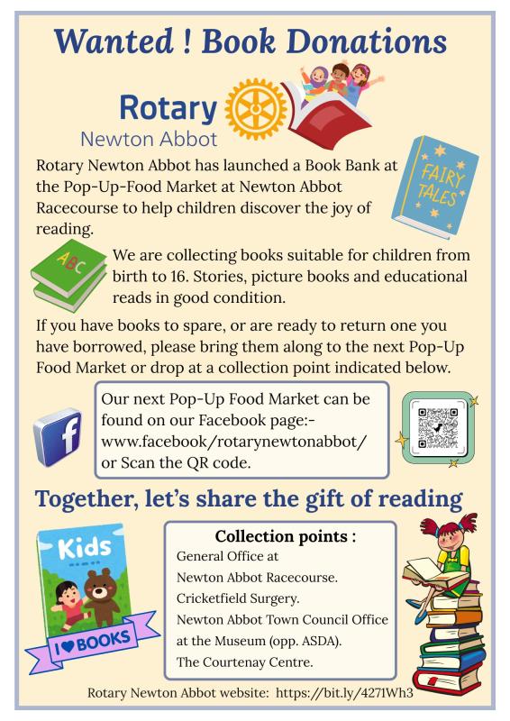 A new initiative by the club to collect secondhand children’s books for ages 0 - 16 years , the aim is to encourage children's reading.