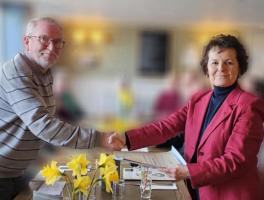 Contact Jonathan Symons about this page:more Well known local auctioneer, Barbara Kirk, was presented with her Penzance Rotary membership certificate and lapel pin, by President Nigel Clark, when members gathered for a social lunch in February (2025).