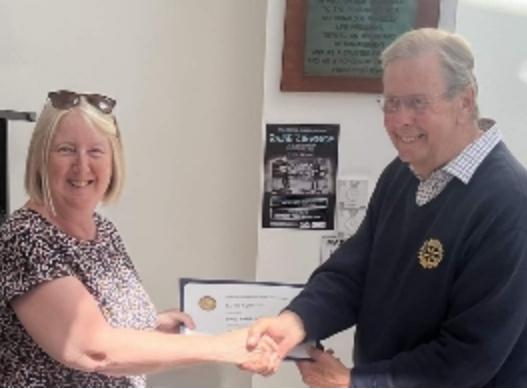 more Well known local auctioneer, Barbara Kirk, was presented with her Penzance Rotary membership certificate and lapel pin, by President Nigel Clark, when members gathered for a social lunch in February (2025).