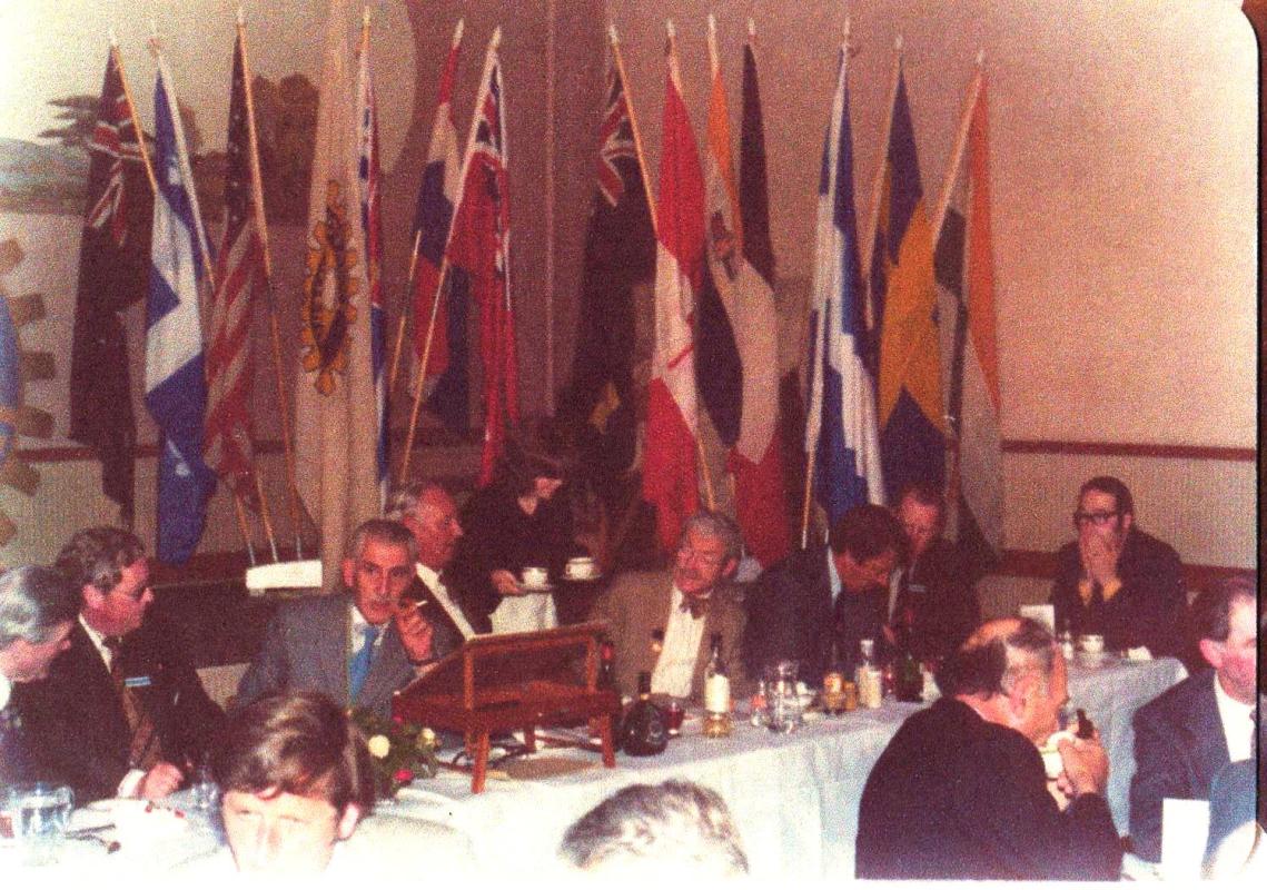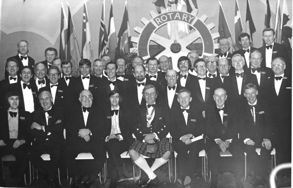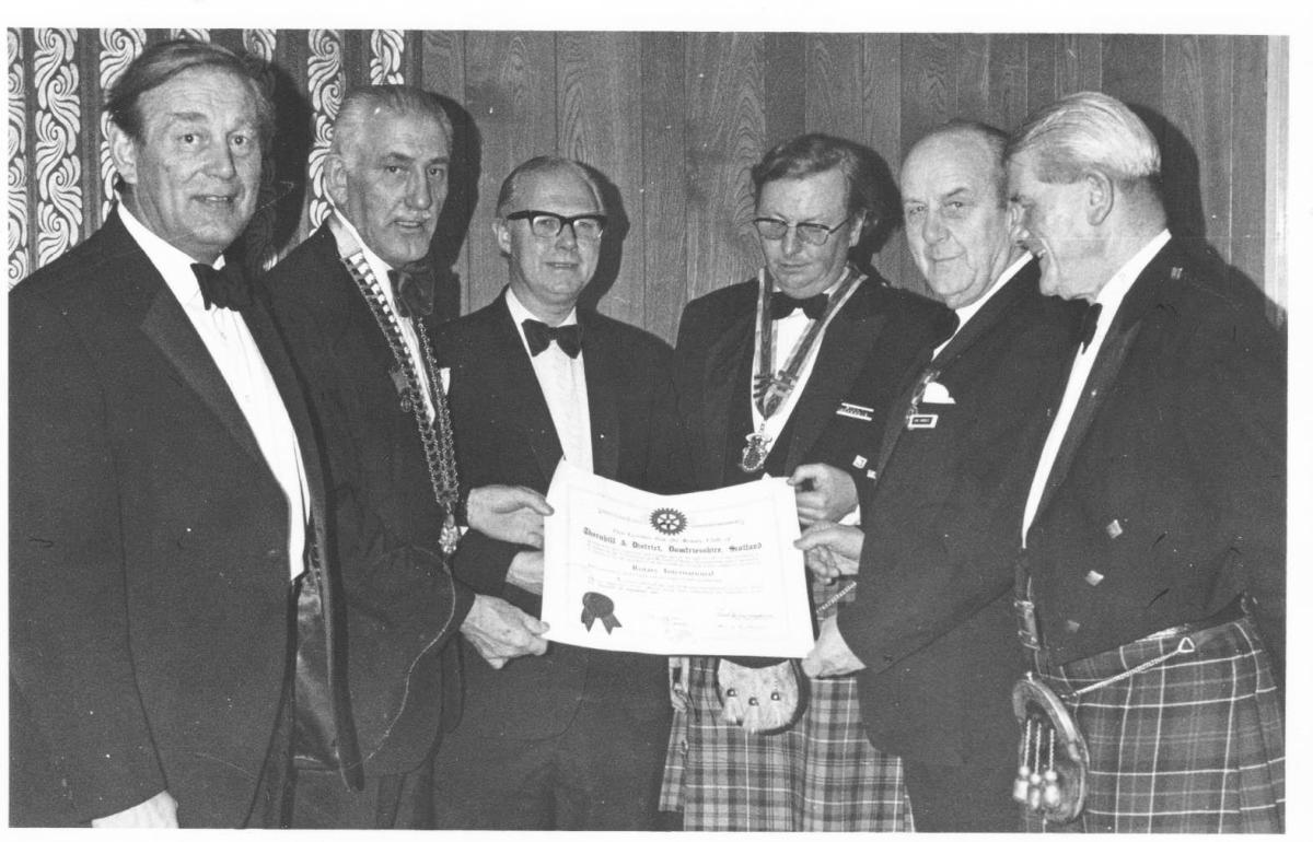 We continued under the care and instruction of the District Extension Officer and senior members of Dumfries Rotary, our “mother” club until our R.I. Membership Charter was presented at a celebration dinner on 22nd November 1975. Bill McKenzie was installed as president with Andrew Watson as senior vice president.