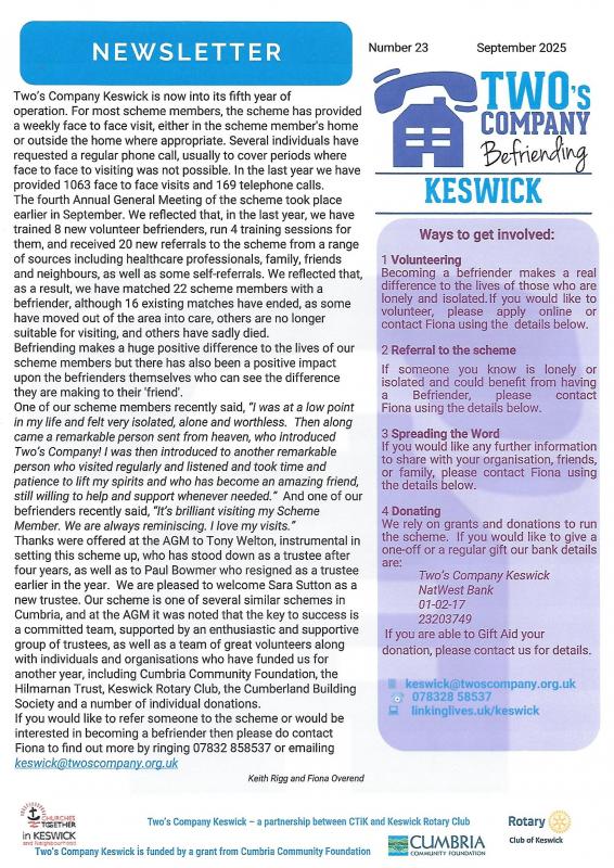 moreTwo’s Company Keswick is a befriending project which has been set up as a partnership between Churches Together in Keswick and Keswick Rotary Club, with support from Age UK West Cumbria.