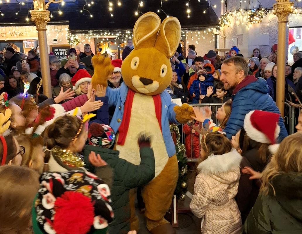 Keswick Rotary invited Peter Rabbit to switch on the lights in Packhorse Court, supported by St Herbert's school Choir and KAOS.