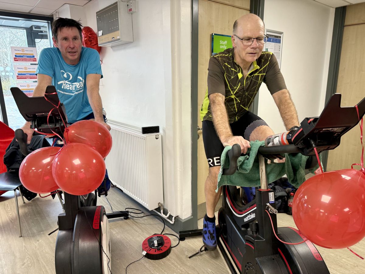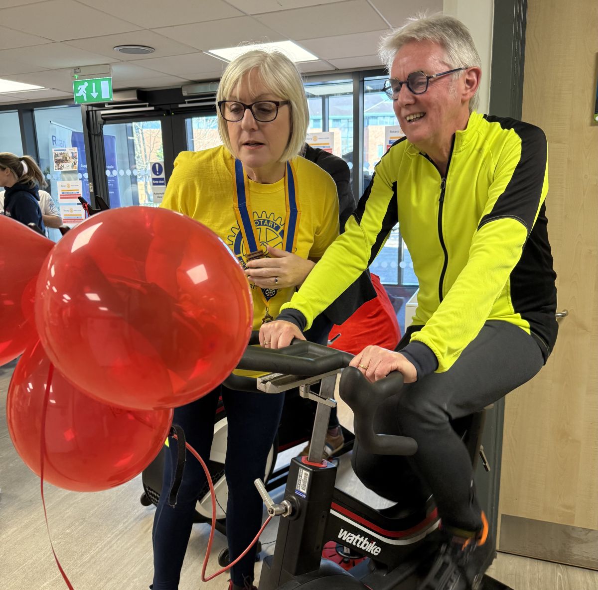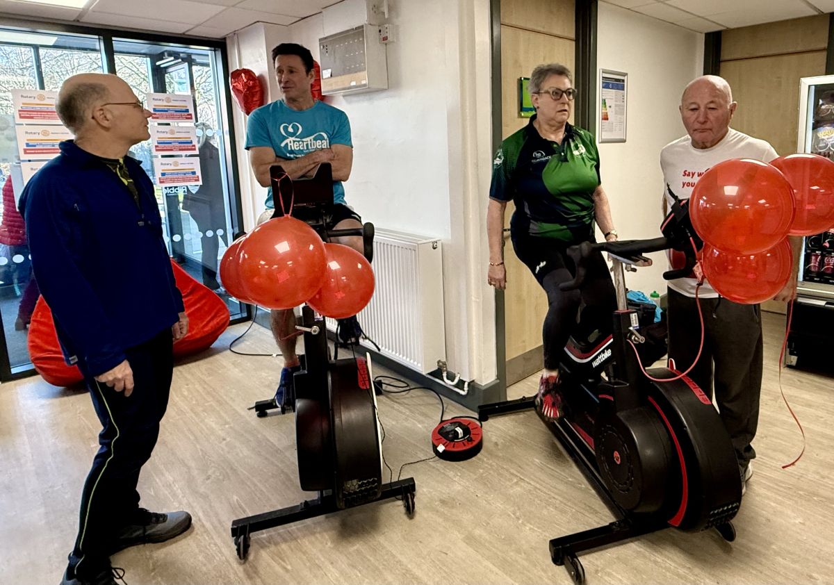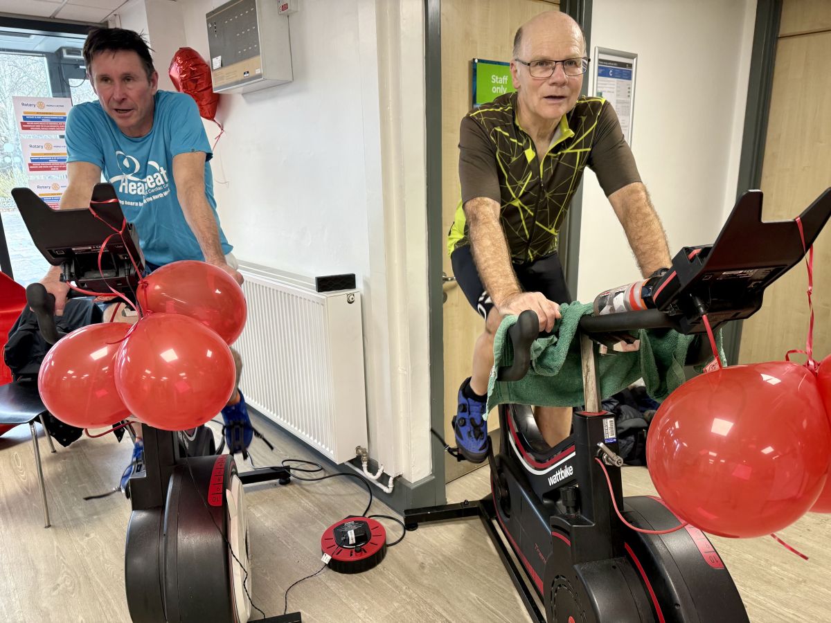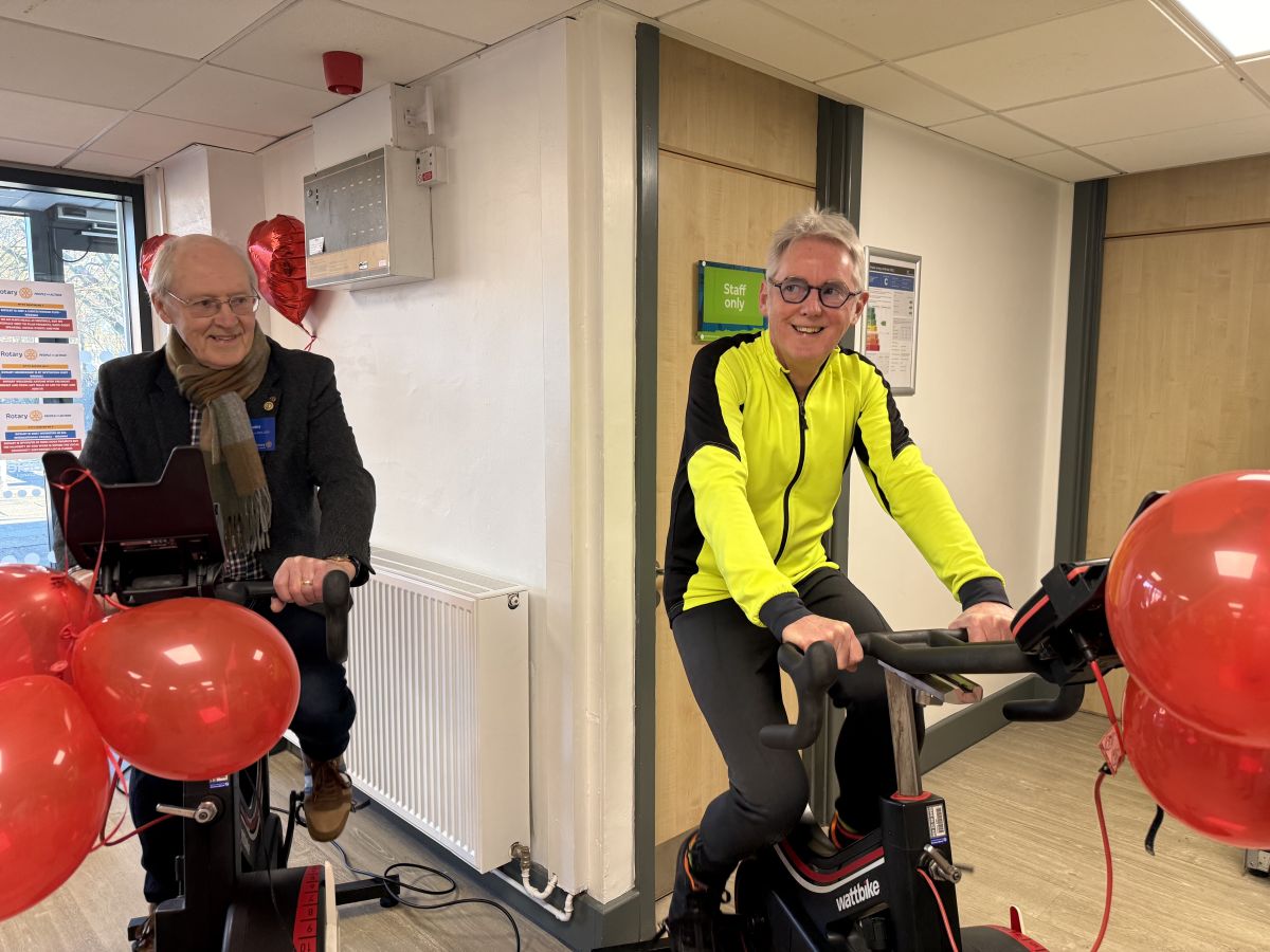 The Mayor of South Ribble, Councillor Paul Wharton-Hardman BEM and Leyland Heartbeat user, Bob Fitchie, got the Cycle Challenge off to a flying start and were followed by another 19 riders, including Rotary's District Governor, John Edwards, who jumped on the bikes at Leyland Leisure Centre to help us raise vital funds for local charity Heartbeat NWCC.