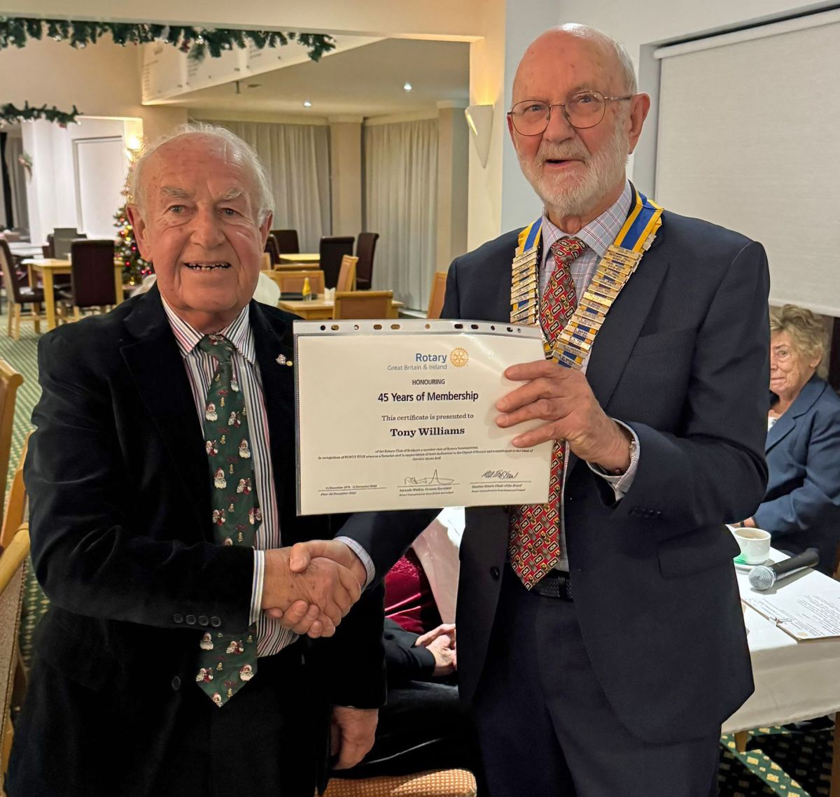 After the Christmas Dinner President Bernard presented PP Mike Green with his Past Presidents Jewel. Rotary Long Service Awards were then given to Clive Jeanes - 30 years; Martin Whiting and David Weston- both 35 years and Tony Williams - 45 years!