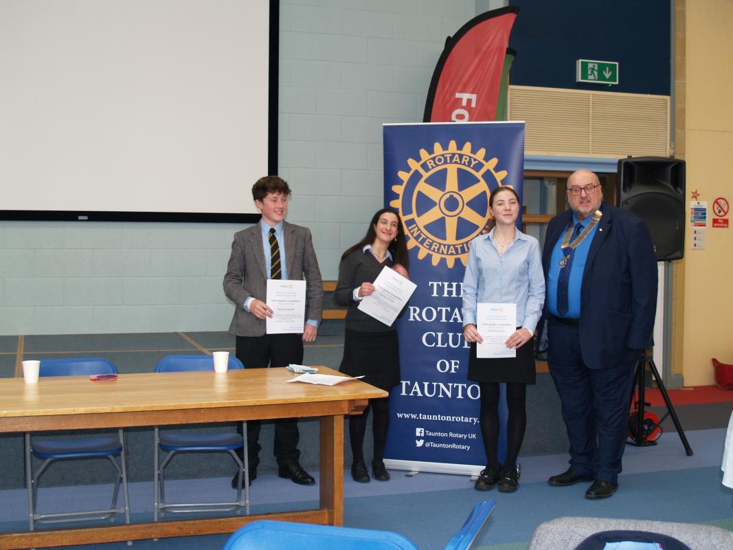 Budding young speakers displayed their talents to an impressed audience and judging panel in the first round of the Rotary Youth Speaks Competition. The event was hosted by The Rotary Club of Taunton. Club President, Adrian Prior-Sankey, presented awards to the successful competitors.