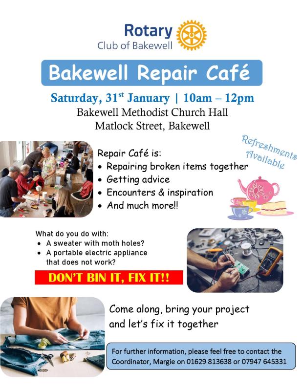 The Club's Repair cafes help to reuse, repair and recycle items instead of adding to the millions of tonnes of landfill every year. The volunteers have repaired wooden items, lamps, even a garden brush and saved them from being thrown away. As part of an international repair movement the Café will be held again on Saturday 31st January from 10.00am to 12:30pm (last items 12 noon) at the Bakewell Methodist Church Hall.
