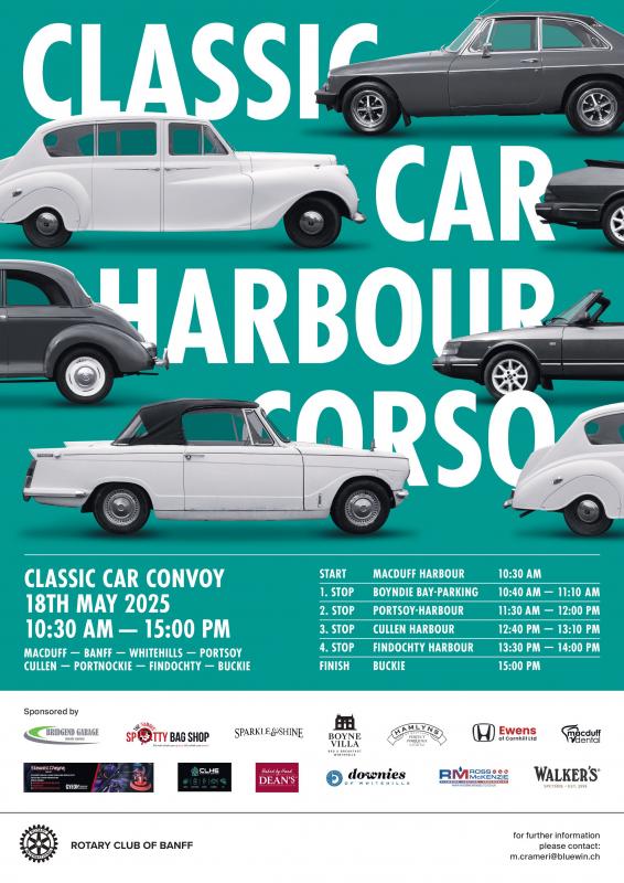 Come and see up close classic cars as part of a “Classic Car Convoy” charity fundraising event that Rotary Club of Banff is organising on 18th May 2025. In the past, we have organised a Classic Car ‘Ride-in-the-car’ Experience. This year, for the first time, we are organising a Classic Car Convoy from Macduff Harbour to Buckie Harbour with four 30-minute stops at Boyndie Bay, Portsoy Harbour, Cullen Harbour and Findochty Harbour. The idea is that we are taking the cars to the people, rather than, as in the past, that the people come to see the cars. The timetable for the 'convoy' is: