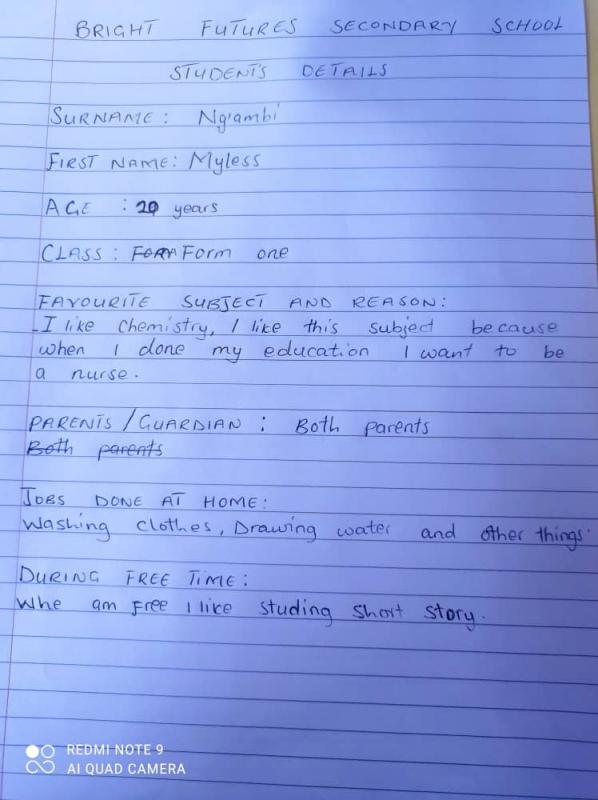 Myless started secondary school in September 2025. You may have spotted that she is 20 and thinking that's quite old for starting secondary school. Many pupils, for a range of reasons, are not able to attend school year in year out and can be teenagers when they finish primary school. Being able to afford secondary education and family support demands often cause delays in getting educated. You will see in the attached note written by Myless that she wants to be a nurse and hopefully after finishing her 4 years at High School she will be able to go onto do this.