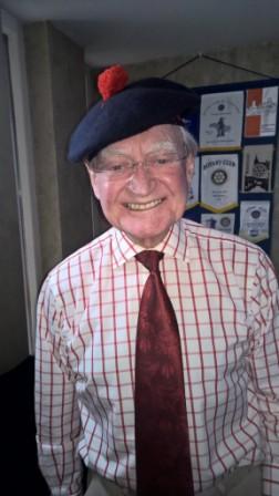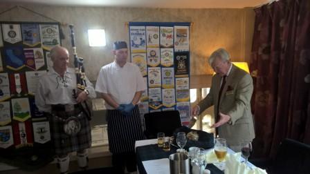 It was a very smooth move to the new venue in the Bruce Hotel for East Kilbride Rotary Club. A good attendance, guests, enjoyable food and pleasant company was the ideal setting for our Friday Burns Lunch. Rotarian Roddy Shanks piped in the haggis carried on a silver salver by the chef. The Rotarians are fortunate to have Burns aficionado Ian Macpherson as a member of their club to perform the Address to the Haggis. As soon as Ian utters the words “Fair fa’ your honest, sonsie face” the members know they are spectators to a superb delivery of the Address to the Haggis, full of theatrics, licking his fingers with the dews of the haggis and hacking it open with a ceremonial knife while the chef dodges Ian’s flourishes of the knife. After a tasty feed of Cock-a-leekie Soup followed with haggis neeps and tatties we settled down to a memorable recital of Tam o’Shanter. Donning his Tam-O-Shanter hat Ian launched into this extremely long Robert Burns epic poem of bousin at the nappy, swapping tales with his friend Souter Johnnie and culminating with Tam and his horse being chased by witches. This was brought to life with slides of wonderful caricatures of Tam, his friends, Maggie the mare and his sulky, sullen wife Kate. A very successful start to future lunches at our new venue.