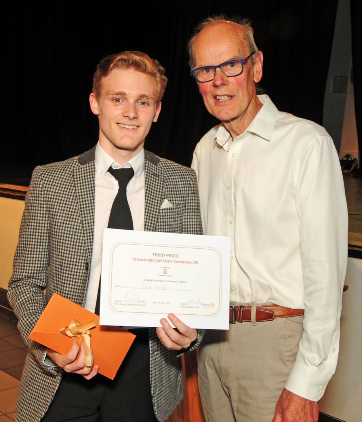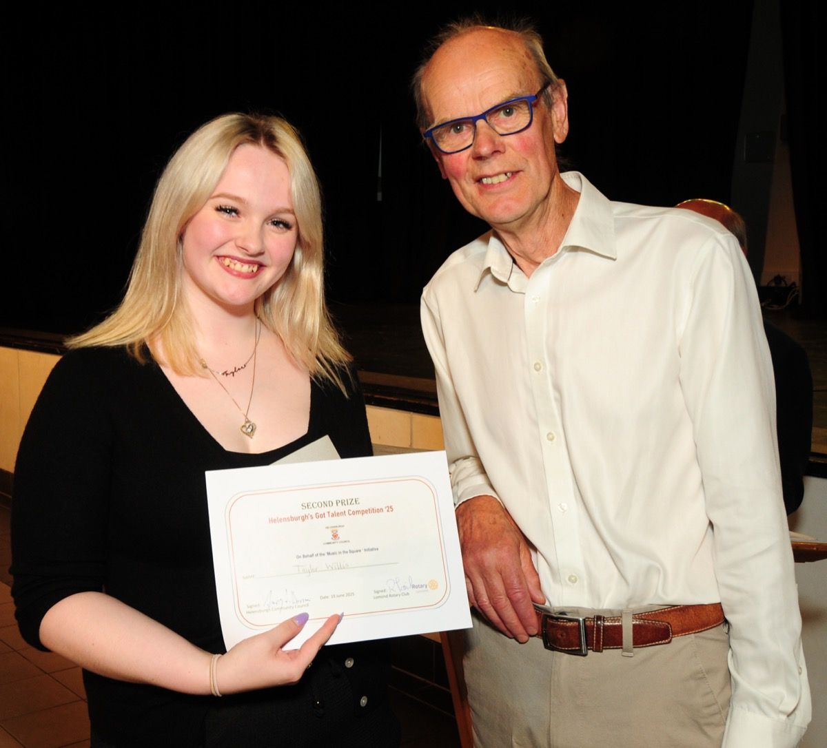 Members of Lomond Rotary were delighted to be part of the Helensburgh's Got Talent 2025 Competition helping both in front and behind the scenes at Hermitage Academy last week. Organised by Helensburgh Community Council as part of their Music in the Square initiative the evening saw nine acts take to the stage and thoroughly entertain a large and appreciative audience. Lomond Rotary President Richard Trail presented the winners with their prizes. Three vocalists took the top spots. 1st Anna Hitchell, 2nd Taylor Willis and 3rd Chris Forth