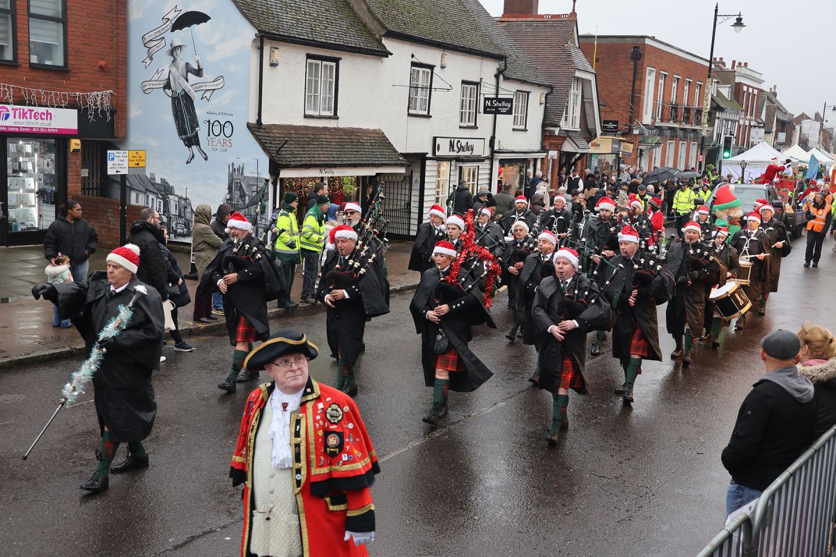 A very enjoyable event along the whole High Street, a short but colourful Christmas parade including Santa, led by Town Crier Jim Shrubb, some turkeys, a snowman, stilt men and women, and the pipers!