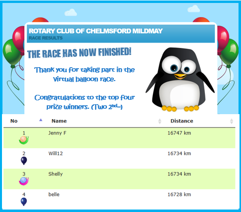 The Race has now finished! Thank you for taking part. Full details at https://www.balloonrace.net/rcocm Congratulations everyone and in particular the top four winners. Two were = in 2nd place!