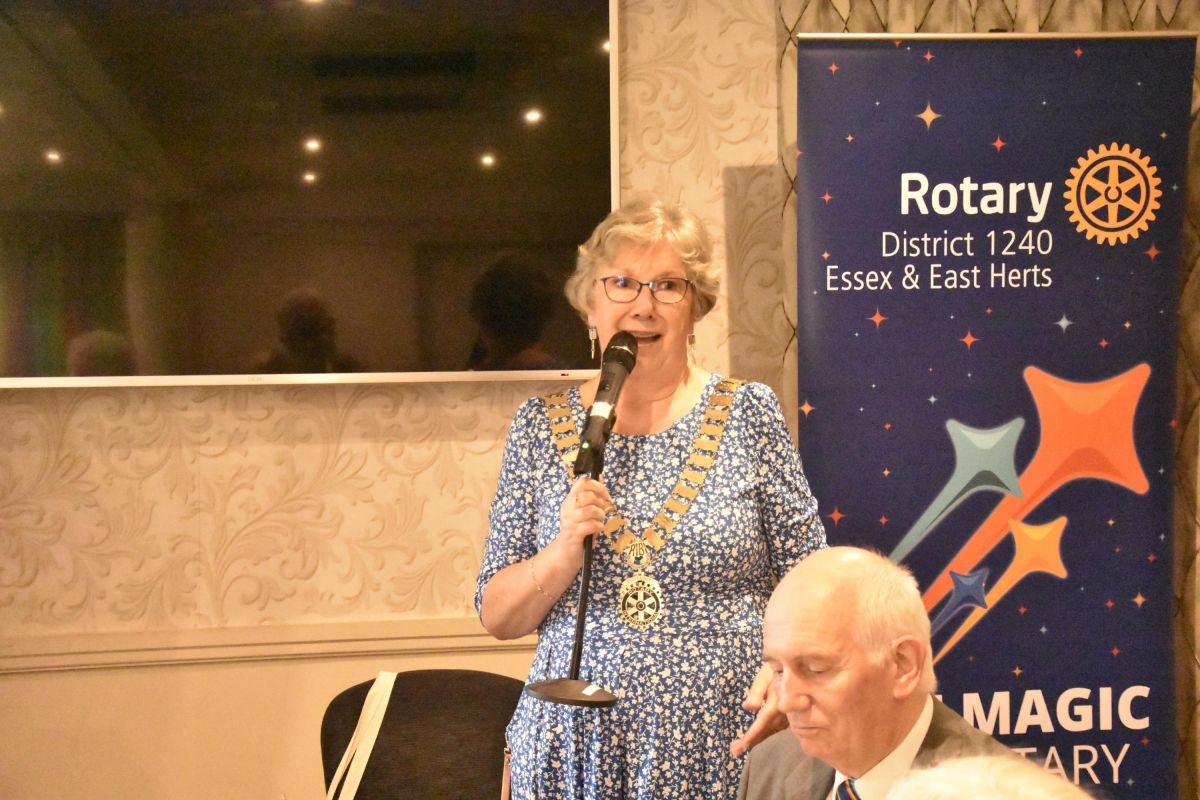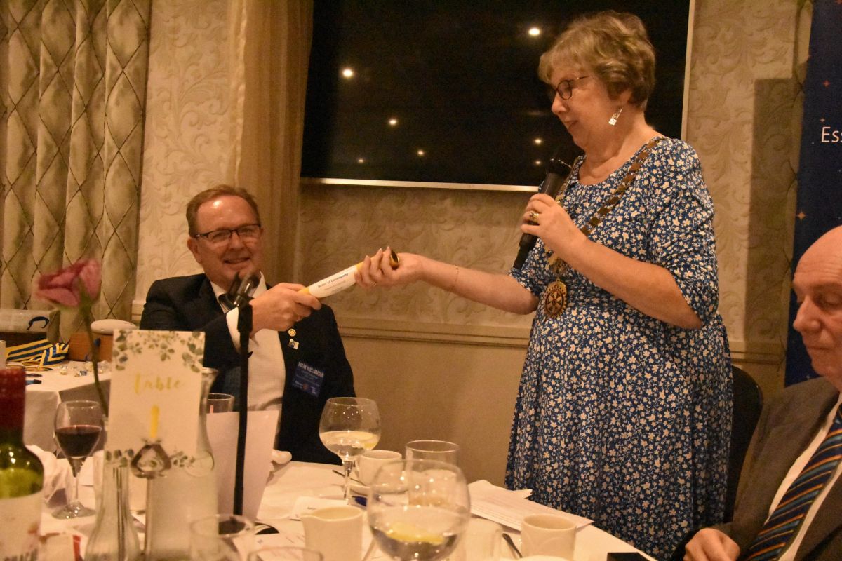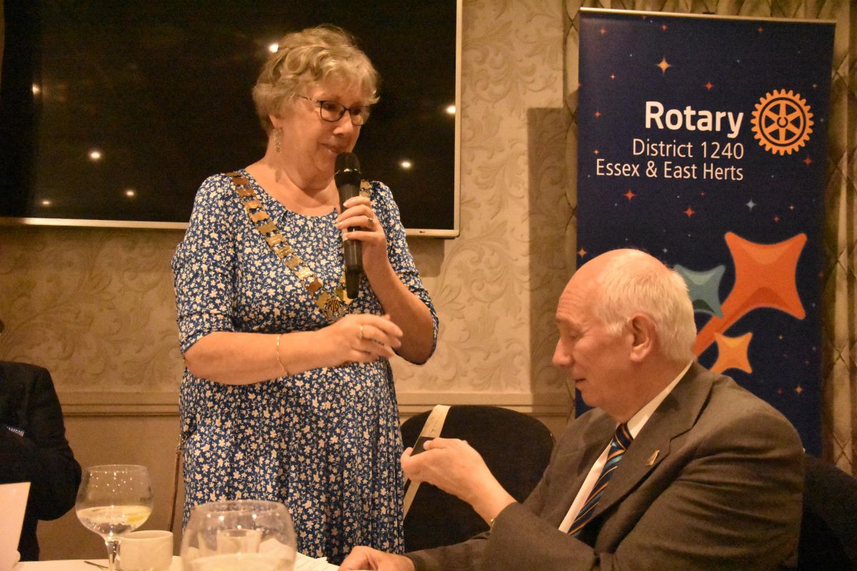 During the Handover meeting Past District Governor Anne thanked a number of peole who had supported her during the year, with special thanks going to Malcolm Tugwood from Canvey Island Rotary Club and Lesley Sulley from Colchester Camulos Rotary Club and to her husband Stephen for his support during her year in office, presenting all three of them with a Paul Harris Fellowship award.