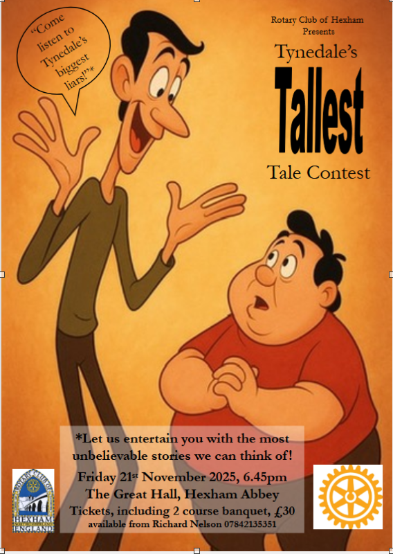 Finally, we are equally happy to have the event attended by members of the general public, and by way of publicity I have prepared the attached poster. This is a further point upon which I need help from all Club members. Please consider whether you are aware of any locations where a poster could be displayed. This is especially important in areas outside of central Hexham, (which I will be covering). If you have contact with any shop, village hall or the like outside of central Hexham, please ask if they would be kind enough to display the attached.