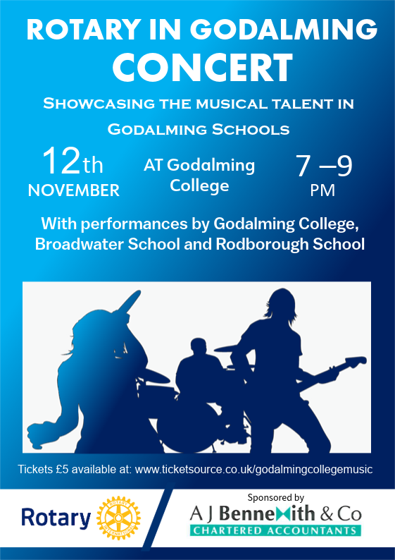 Rotary in Godalming Concert at Godalming College with performances by Godalming College, Broadwater School and Rodborough School. Tickets £5 from www.ticketsource.co.uk/godalmingcollegemusic