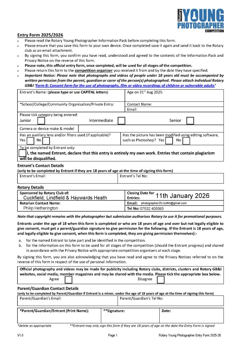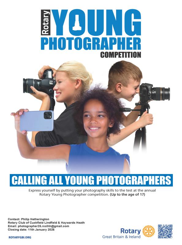 moreEnter the Rotary Young Photographer of the year 2026 Running to a National Level There are three age groups: Junior - up to 10 years old Intermediate: 11 to 13 years old Senior - 14 to 17 years old Entry closes on 11th January 2026