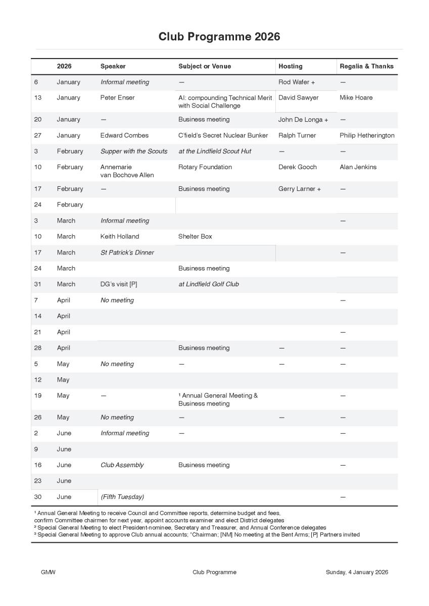 Cuckfield Lindfield & Haywards Heath Rotary Club meets most Tuesdays at 7pm for 7.30pm for supper, friendship, social interaction, business and hearing an interesting speaker.