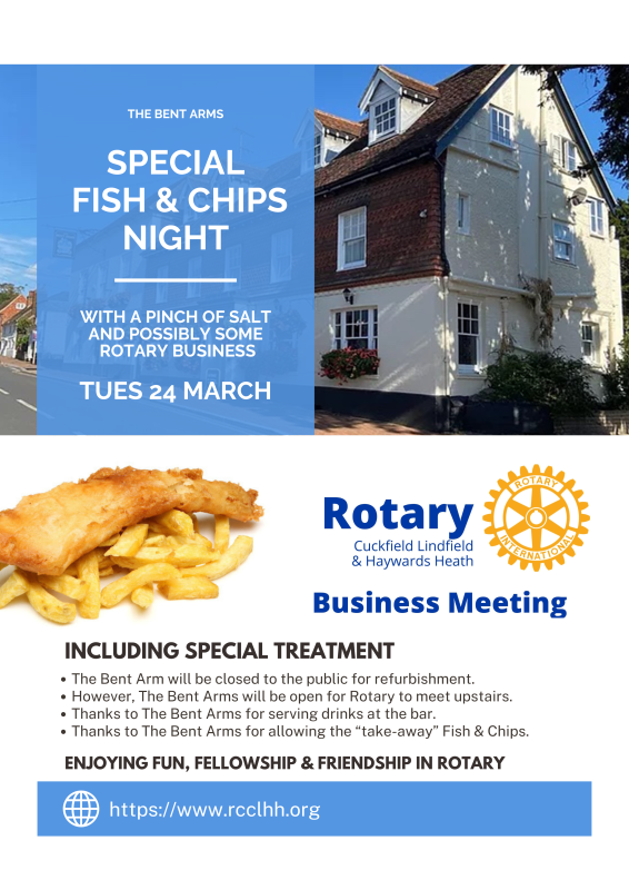 Cuckfield Lindfield & Haywards Heath Rotary Club meets most Tuesdays at 7pm for 7.30pm for supper, friendship, social interaction, business and hearing an interesting speaker.