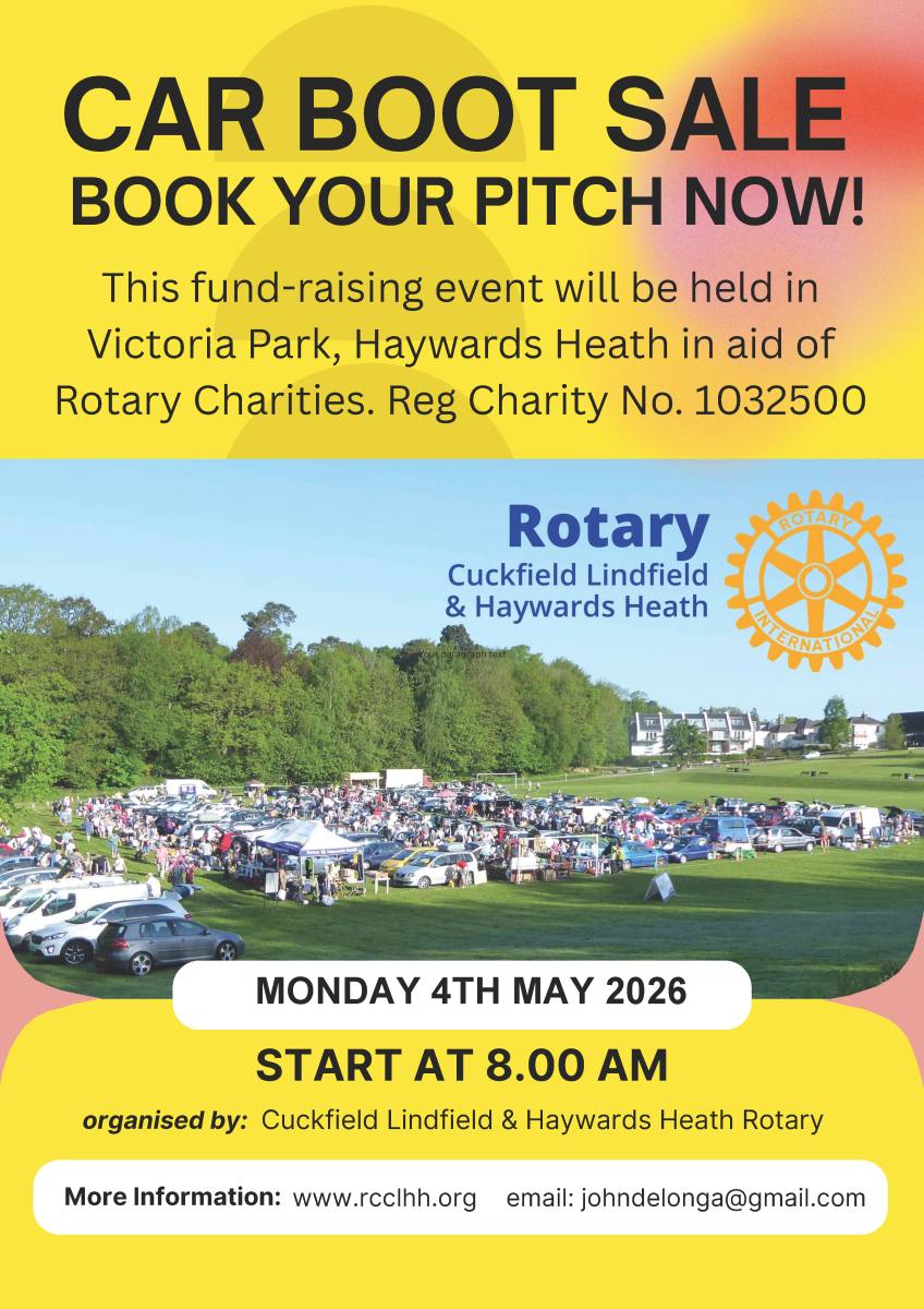 Cuckfield Lindfield & Haywards Heath Rotary Club meets most Tuesdays at 7pm for 7.30pm for supper, friendship, social interaction, business and hearing an interesting speaker.