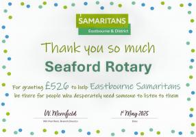 more SEAFORD ROTARY responded to a grant application from Eastbourne Samaritans and provided the funding for a Royal Mail, mail drop to all households in Seaford and the surrounding areas.