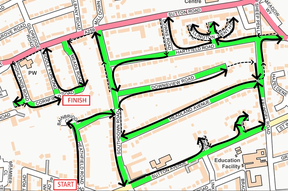 Heathfield Road, Southdown Road, Sutton Avenue (West), Arundel Road (North), Headland Avenue, Downsview Road, Hartfield Road, Meads Road, Highlands Road.