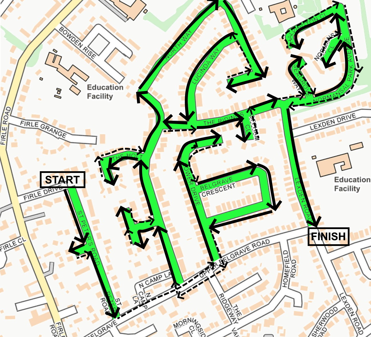 St Peters Road, Lower Drive, Belgrave Crescent, North Way, Lucinda Way, The Ridings, Normansal Park, Lexden Road.