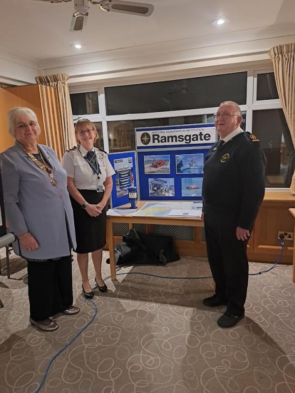 Yvonne Smith the secretary and Dave Coupland, Training and Quartermaster, gave members the reasons for the formation of the institution and how this evolved after the Coast Guard lookouts were withdrawn. Now The National Coastguard Institution, a charity, has lookouts around the country, the nearest one in Thanet being on the clifftop on Victoria Parade Ramsgate. The picture shows Yvonne and Dave with club President Maria .