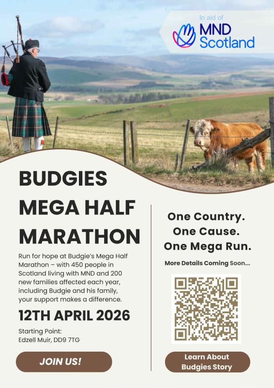 Run for hope at Budgie's Mega Half Marathon - with 450 people in Scotland living with MND and 200 new families affected each year, including Budgie and his family your support makes a difference.
