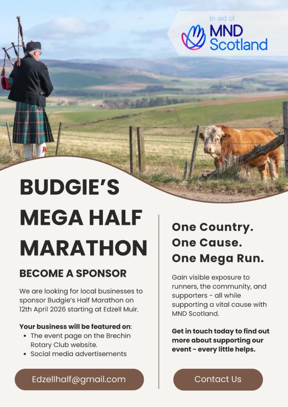 We. are looking for local businesses to sponsor Budgie's Mega Half Marathon on 12th April. 2026 starting at Edzell Muir.