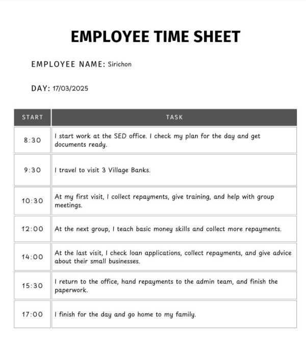 Here's a glimpse into Sirichon's day to day tasks, when working with entrepreneurs and Village Banks (these are small, community-led