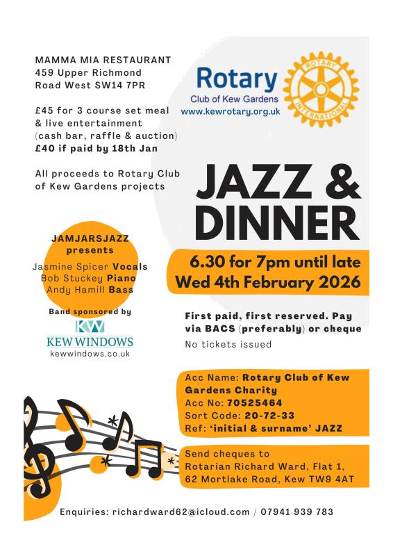 Places are £40 per person,(£45 after 18th. January) reserved and payable in advance by BACS to ‘Rotary Club of Kew Gardens Charity A/c No.70525464 Sort code: 20-72-33, and ref: ‘JAZZ’ + lead surname. ……(No tickets/receipts) or alternatively send a cheque for you and your guests to me, Richard Ward, Flat 1, 62 Mortlake Rd, Kew TW9 4AT. Please make cheques payable to ‘Rotary Club of Kew Gardens (Jazz)' and print names of all attendees on the back, with contact email, and I will acknowledge receipt. Strict booking cut-off 31st. January and no refunds after this date.