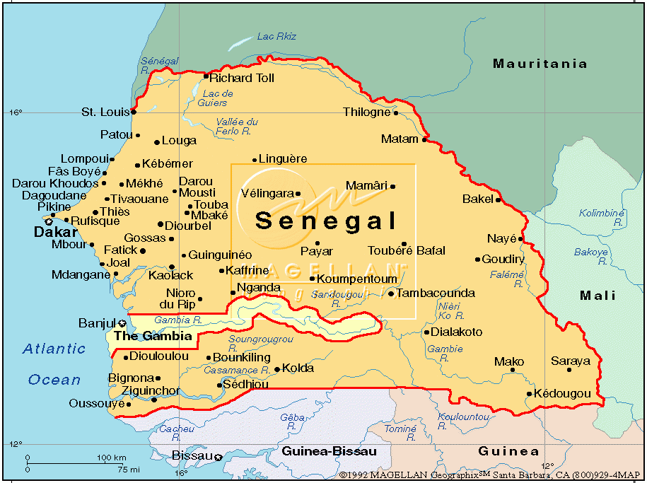 Senegal is the westernmost country in West Africa with the Atlantic to the west, Mauritania to the north, Mali to the east, Guinea to the south-east and Guinea Bassau to the south-west. Senegal almost surrounds Gambia which occupies a narrow strip of land on either side of the River Gambia.