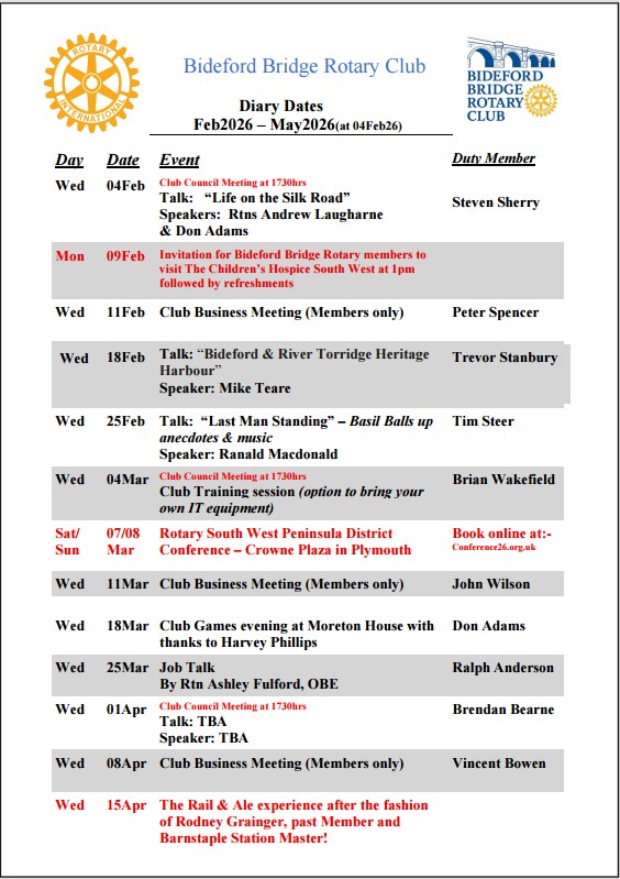 Updated club diary dates February through May 2026 updated 5th Feb 26