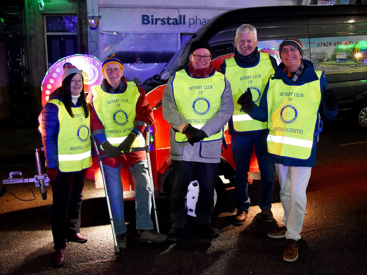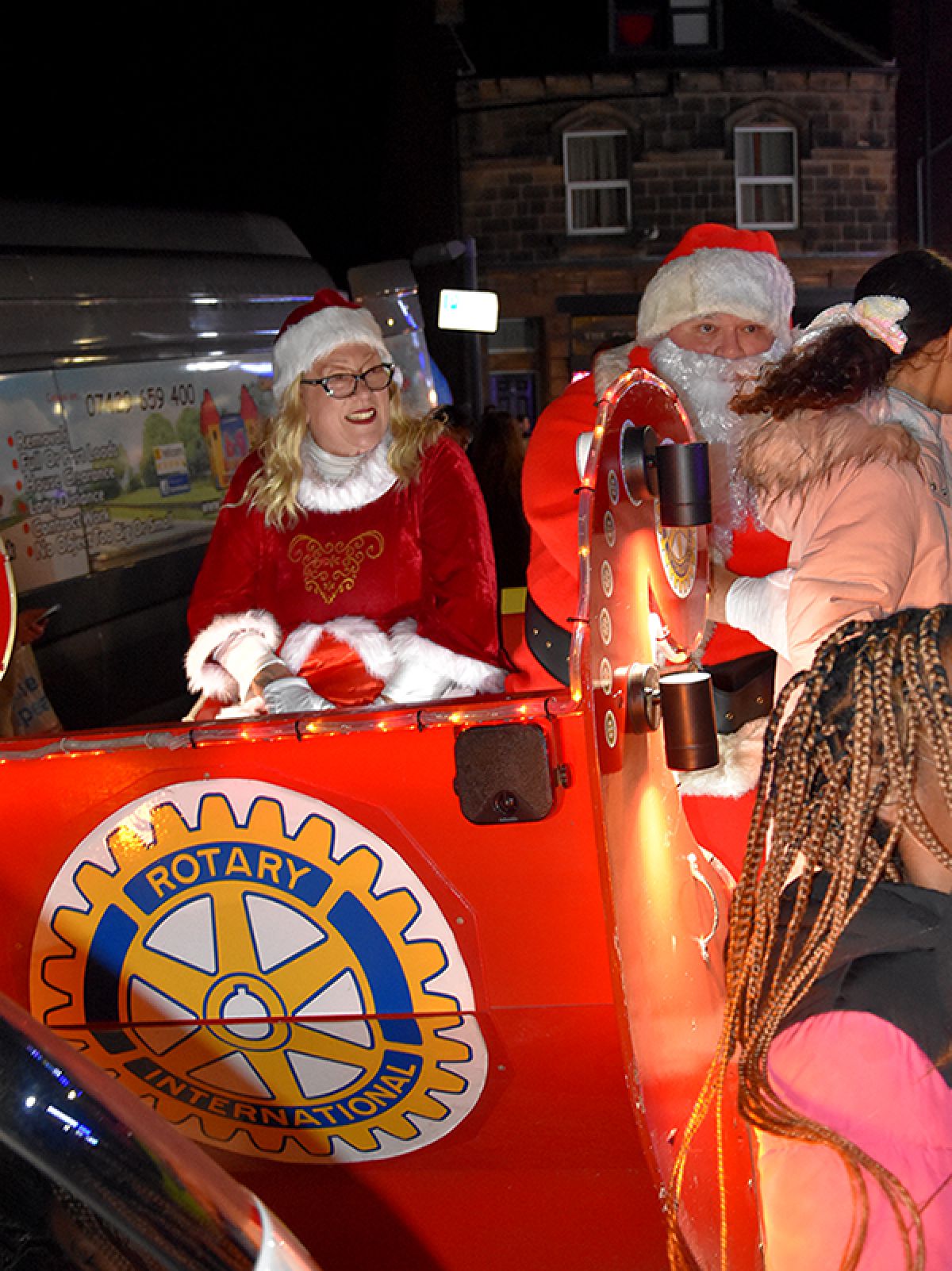 On Tuesday 25th Nov Rotarian Ian led the Santa sleigh into a crowded Birstall Market place assisted by his Rotary helpers with Santa and Mrs Santa ready to greet the families.