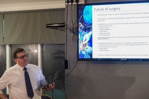 James Clark, a colorectal surgeon, at Treliske Hospital is leading the campaign for a Robot Surgeon to come to Cornwall. He recently visited Mounts Bay Rotary and met with representatives of several Cornish Rotary Clubs (Falmouth, Helston-Lizard, Penzance and St Ives), as well as Derek Thomes MP and Councillor Jayne Kirkham from Falmouth.