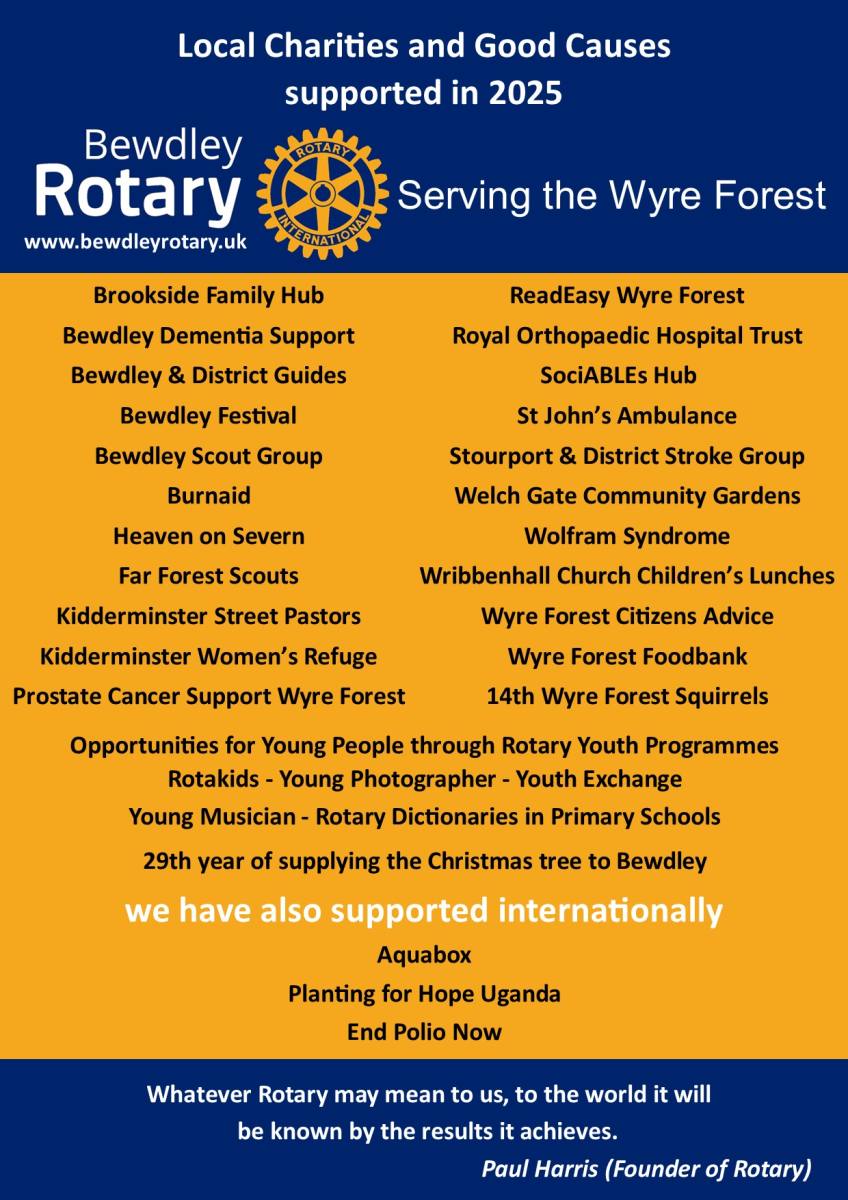 We often get asked what charities Bewdley Rotary supports with the donations given. Click Here to see a list of the charities and good causes supported not just financially but also with time in 2025